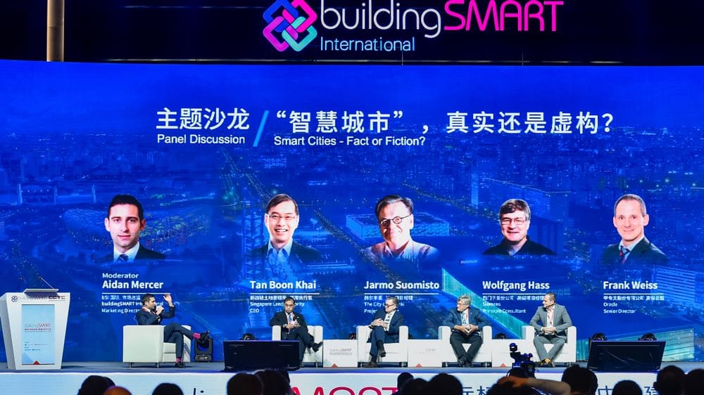 Mr Boon Khai and Mr Suomisto were then joined on stage by Wolfgang Hass, Principle Expert, Siemens, Frank Weiss, Senior Director, Oracle and Aidan Mercer, Marketing Director, bSI who acted as host for the ‘Smart Cities – Fact or Fiction?’ panel. This debate followed different perspectives on what a smart city is and how useful it can be. It was quite quickly ascertained that smart cities are in fact already in operation today and was there more fact than fiction. The topic of digital twins was also mentioned, and its importance was again highlighted as well as the need for an open CDE.