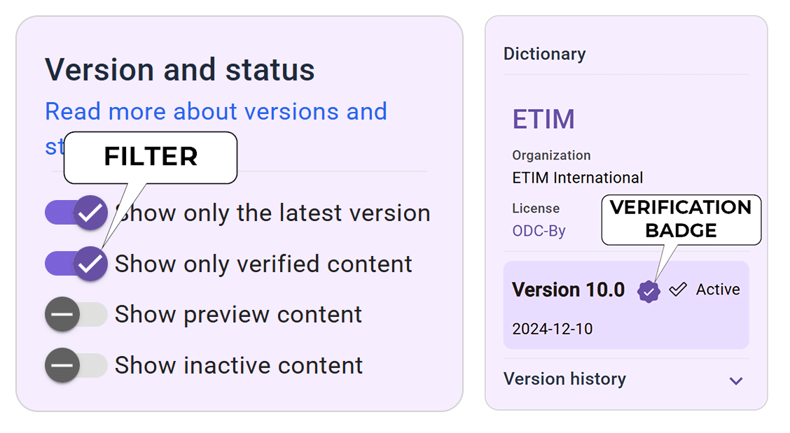 Recently, buildingSMART established the on-request, detailed verification. Content that passes earns a “verified” badge, a proof of high quality. The process follows a detailed checklist, including guidelines from international standards like ISO 12006-3:2022, ISO 23386:2020 and ISO 704:2022. The price of the detailed verification service is determined individually depending on the content - please get in touch with the bSDD team for a quote: contact form.