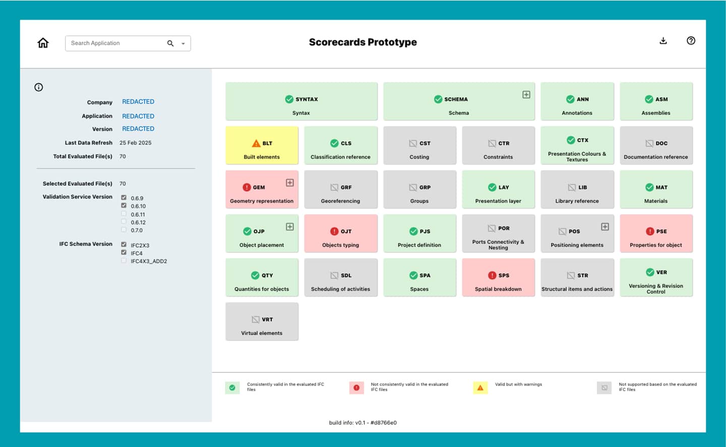 Figure 1: Scorecard how an anonoumised software tool supports IFC. Green is all good; red means there have been errors found; grey means we did not see any support for this part of IFC in this tool. Yellow means 'we found a deviation from common practise'.