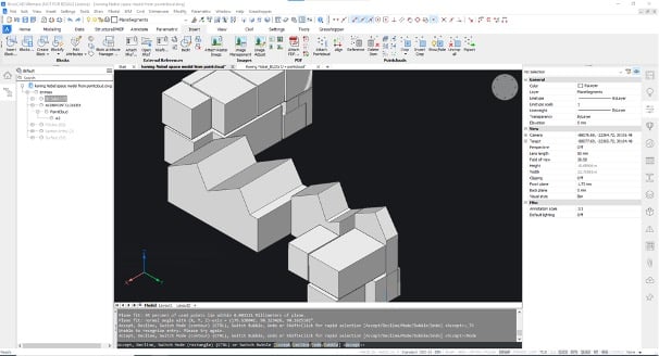 In a final step, BricsCAD uses a smart algorithm to create the exterior walls, floor slabs, roofs and interior walls based on the room volume planes.